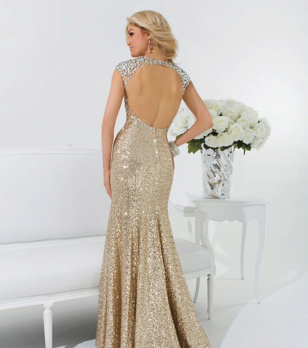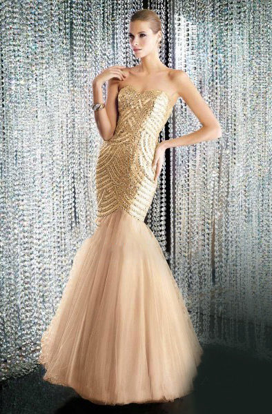 A dress of gold color can be loose fit. In this case, with its mini length, the shortcomings in the waist area will be visually hidden. Too wide or narrow hips will help to “optimize” the dress, flared down. Drapery on the bodice will not prevent women with small breasts. And if the dress has an overestimated waist line, it will emphasize it favorably.