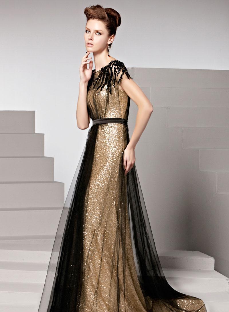Black color favorably emphasizes the golden shade of the dress. This combination can certainly be called a classic.
