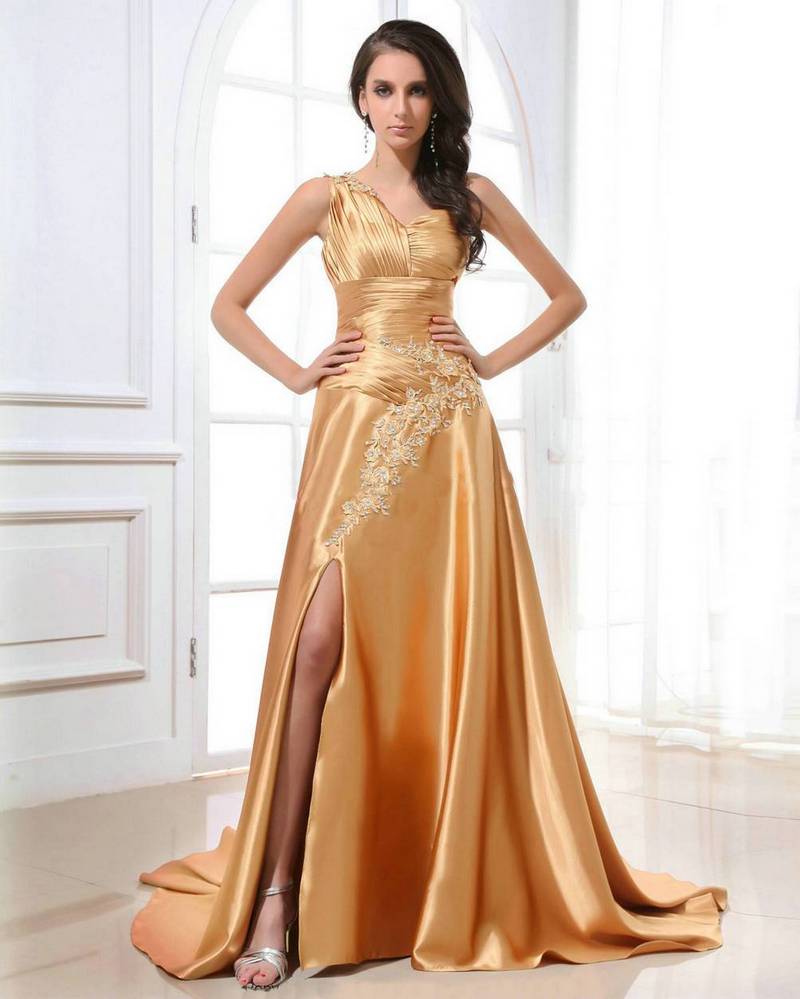 A long golden dress is an ideal choice for events that are characterized by solemnity. This may be a graduation party, corporate party or an evening, the dress code of which implies such an outfit. A gold-colored dress will help hide flaws and emphasize the dignity of the figure.