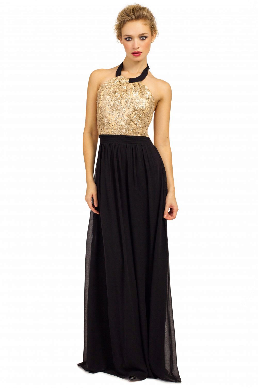 A gold dress looks gorgeous in itself. Therefore, you can do without additional decorations.