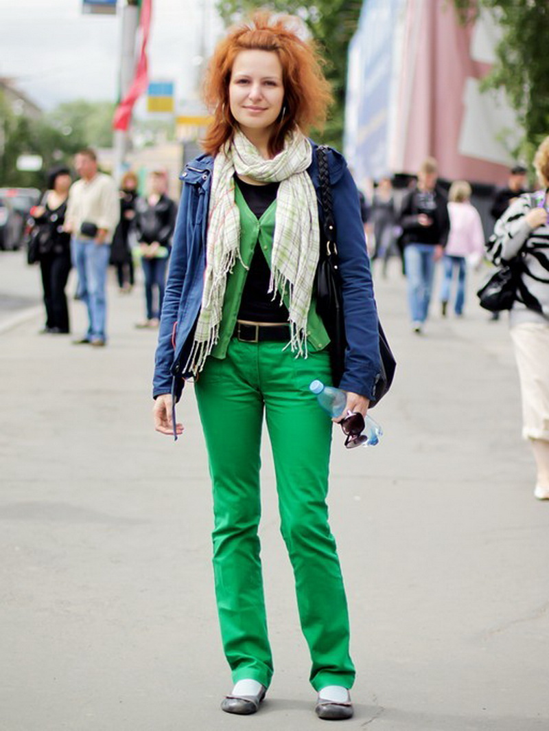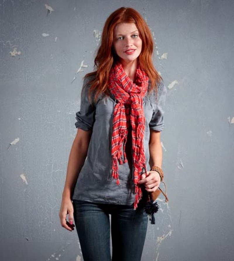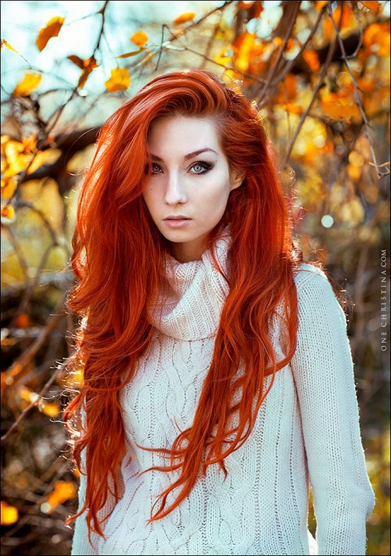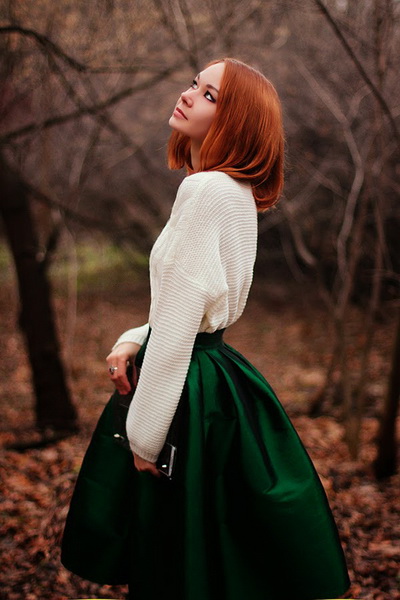This is the second rule of the selection of clothes, because even among red-haired ladies there are those who belong to the type of spring, summer, autumn, and even winter! Peach-colored skin and light blue eyes are the spring type, which should choose shades of pastel, delicate and subtle: peach, soft blue, ocher, lilac. Caramel hair with henna tint, olive skin, brown eyes - summer type in front of us.