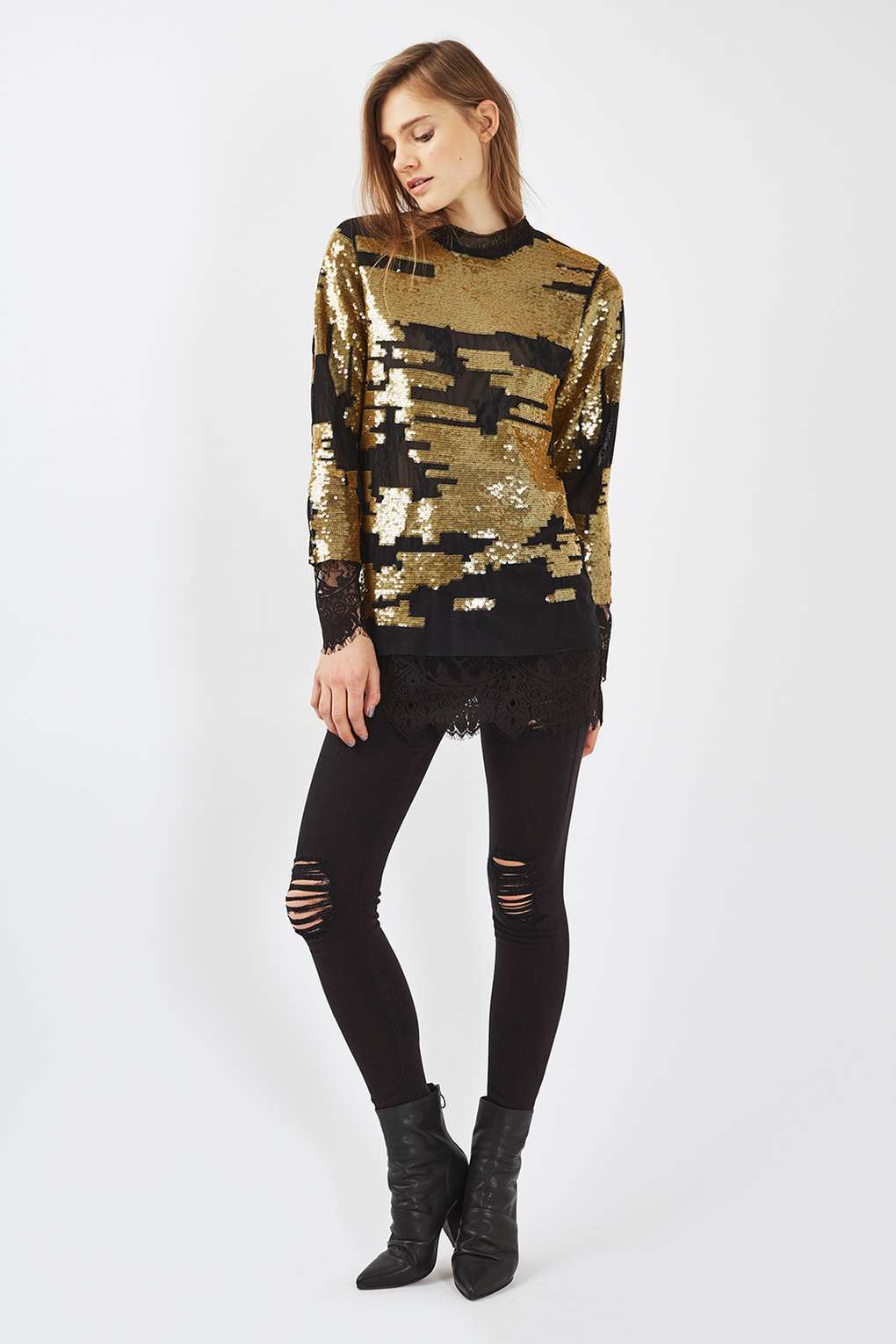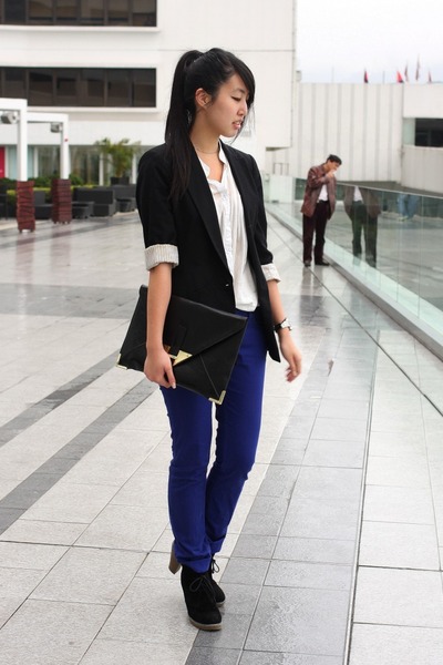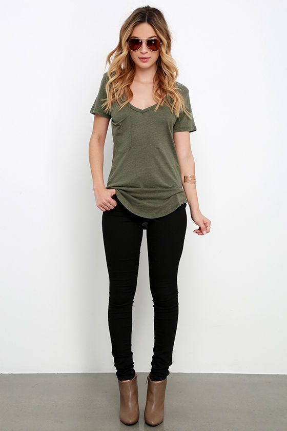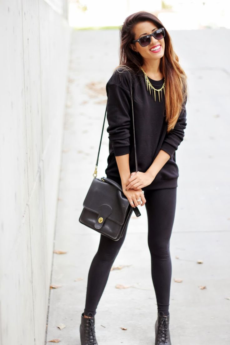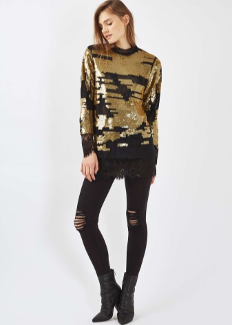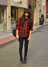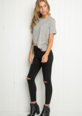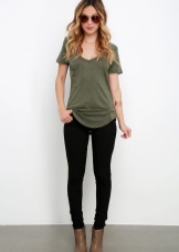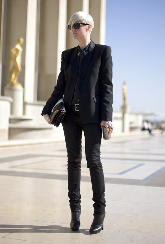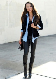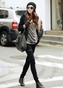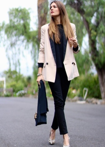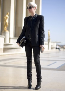 Total black look. Skinny pants, a loose-fitting shirt, shoes, and a small clutch are all, of course, black. Such an image will be good for an evening cocktail party, and if you add a blazer and a roomy bag to it, it will turn into a business outfit.