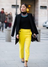 In order not to become like a bee, give up striped clothes. In general, it is better to abandon any prints, preferring monophonic laconic clothing. Yellow pants in combination with a black blouse or a jumper will look great. If you have wide hips, let the bottom be dark, and the top - bright and alluring.
