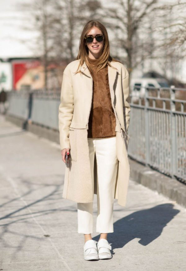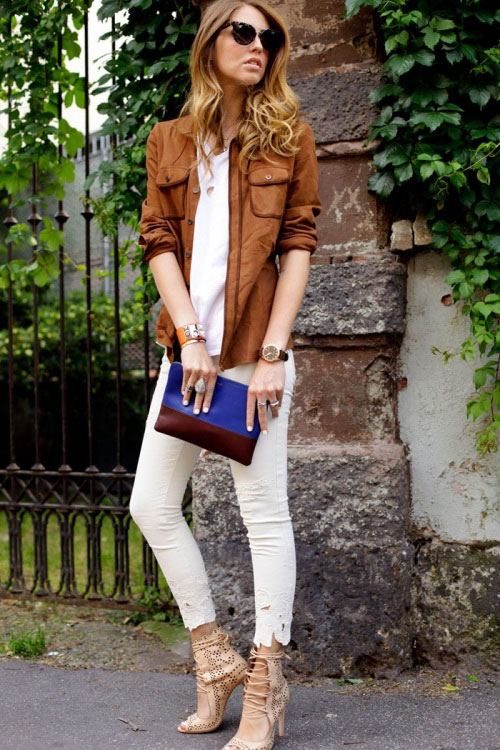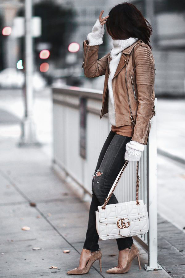 - In everyday wardrobe, give preference to muffled shades of cappuccino and taupu. White mohair sweater with a voluminous collar, skinny skinny jeans, suede leather jacket and matching pumps. The image is complemented by exquisite jewelry and a white handbag on a long strap.