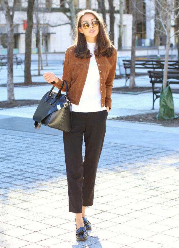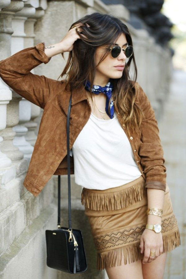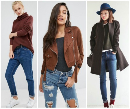 A brown leather jacket can be an excellent alternative to a bored black leather jacket. In the fashion model with a variety of decorative elements - rivets, belts, buckles, fringe. Depending on the style, it will go well with almost any clothing. If you want a universal product for all occasions, then prefer a low-key model in the style of minimalism.