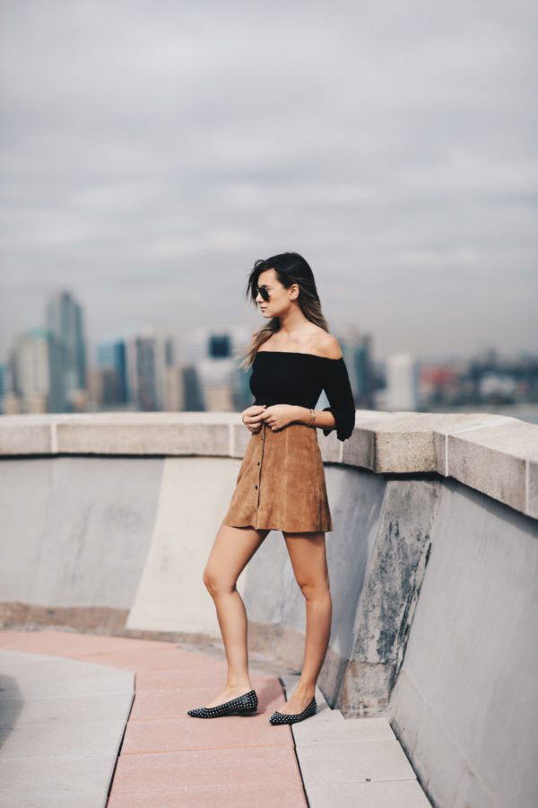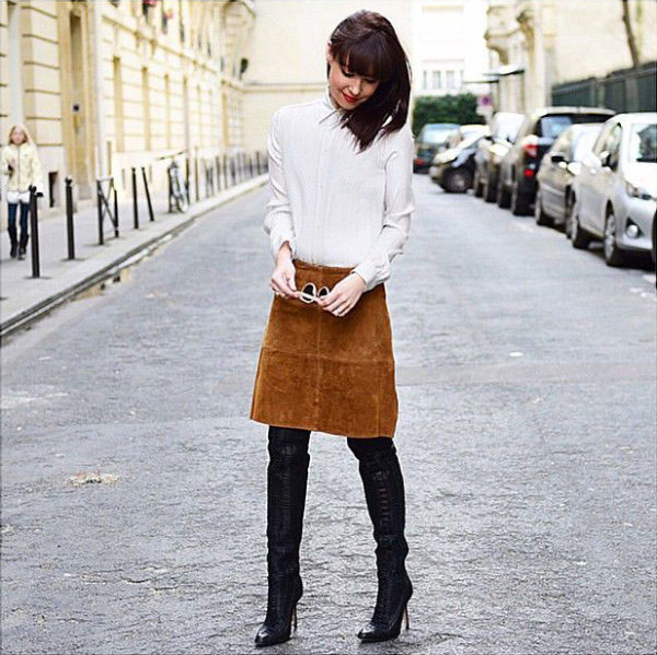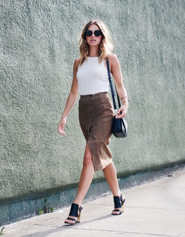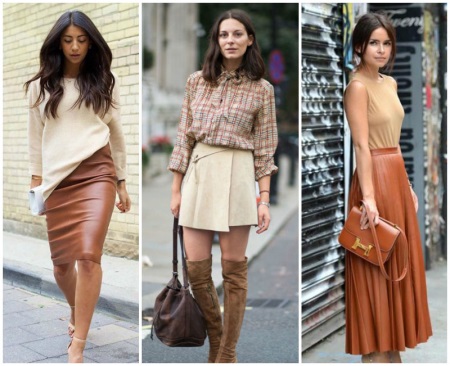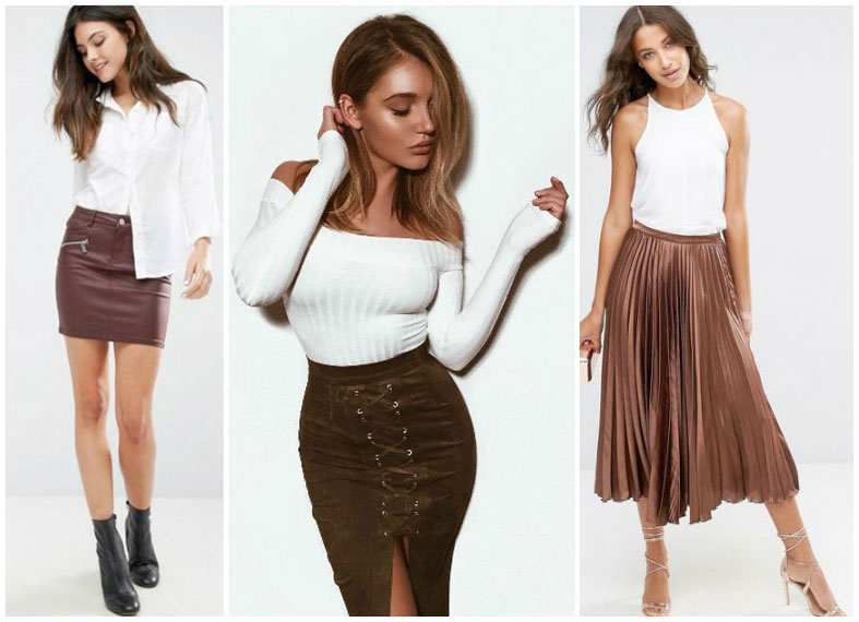 The suit does not have to be a trouser, the skirt or dress of brown color, complemented by bright boats, looks no less seductive.