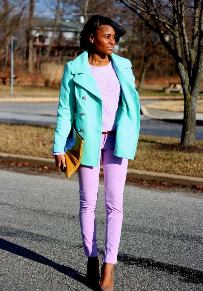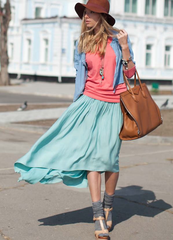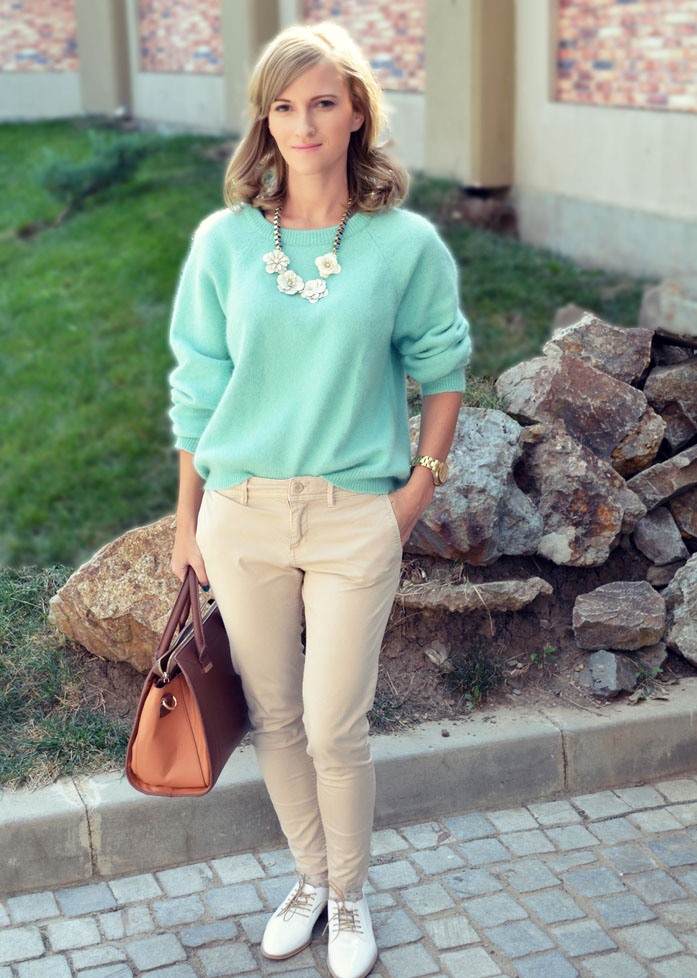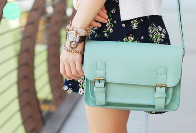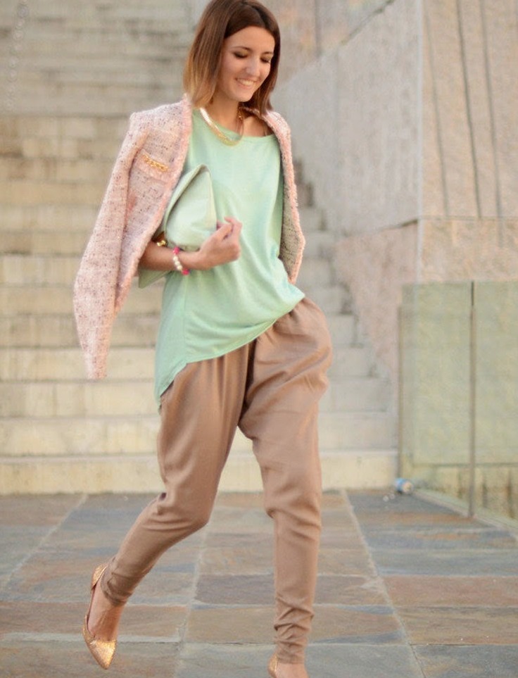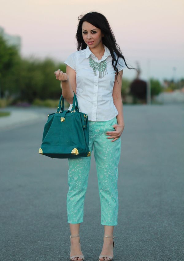 It looks very harmonious mint with flowers similar in tone and scale: adding to the mint thing a soft blue wardrobe item, you can get a delicate and very feminine combination.