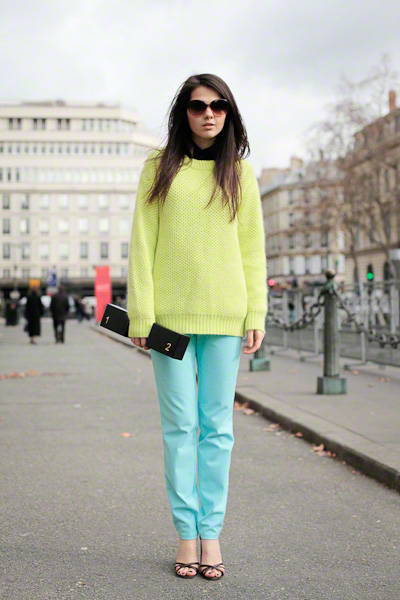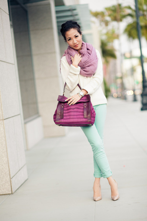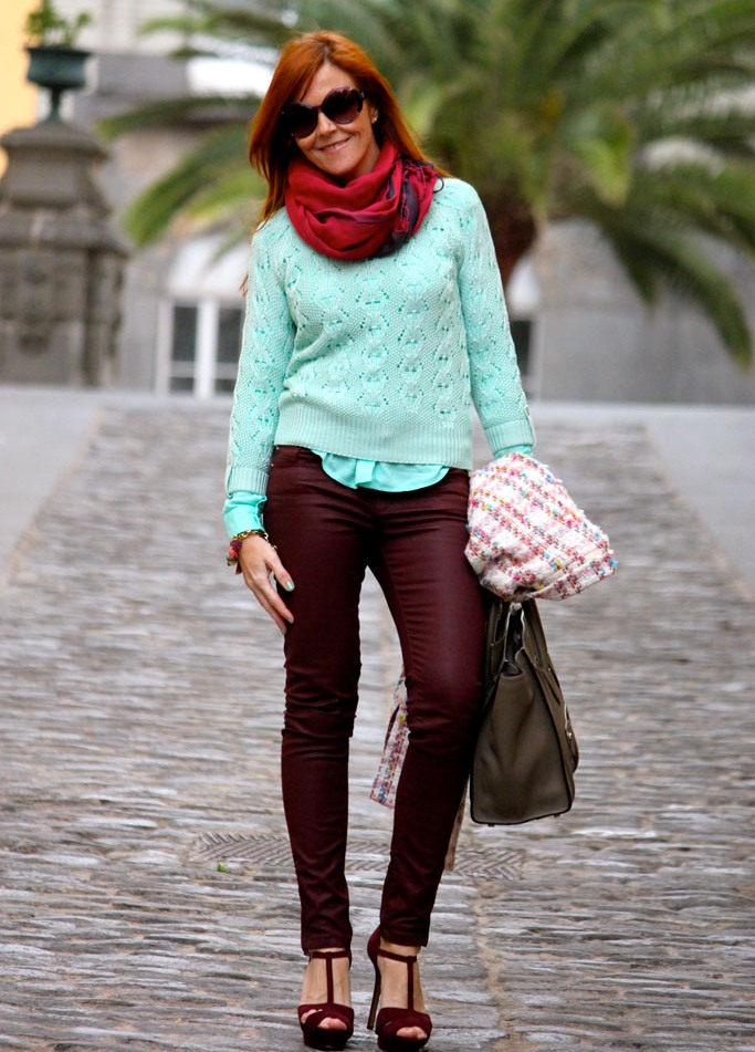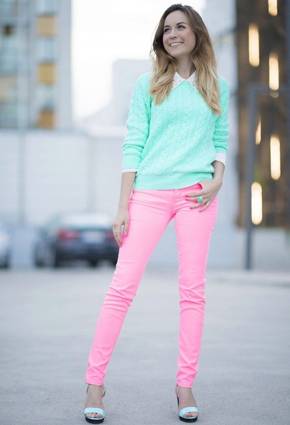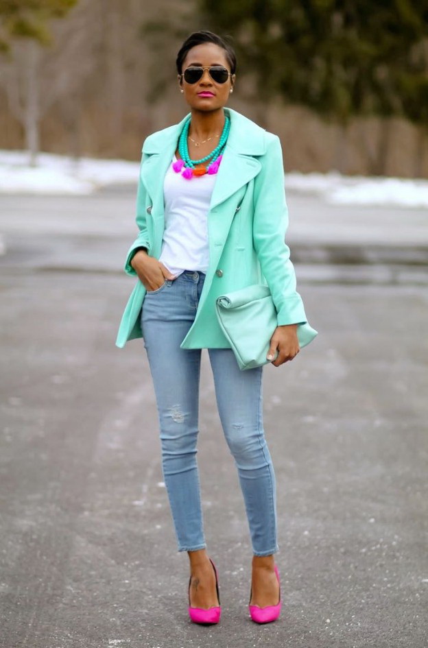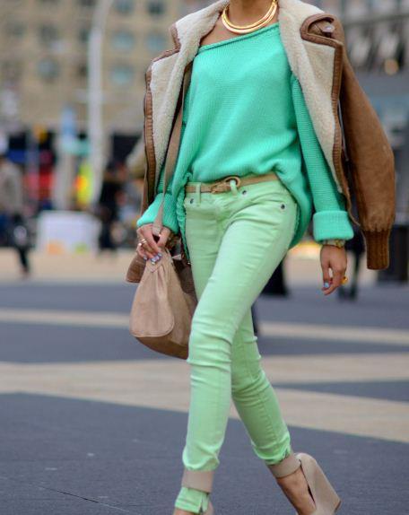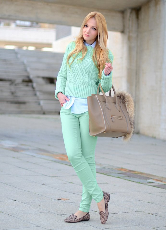One of the most daring and expressive combinations is mint and red. In this image, the balance of colors is achieved due to the fact that each bright object has a pair: a leather jacket finds support in moccasins of the same color and pink details of the necklace. The jumper of a shade of sea foam echoes a bright clutch bag.