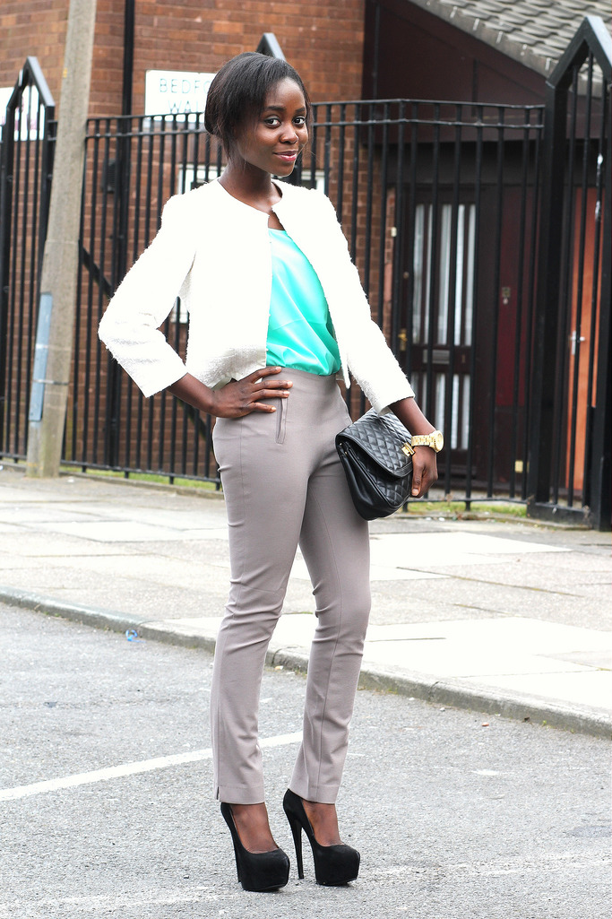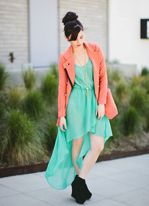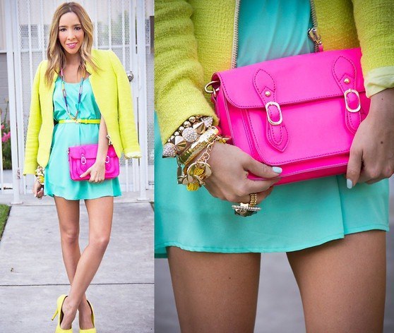 If you add bright color accessories to your mint dress, you will get a great look for a summer party. The jacket and shoes of bright lime color make the set color-balanced. All fabrics used in the image are opaque and dense - this allows you to focus on the symbiosis of bright colors.