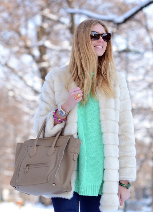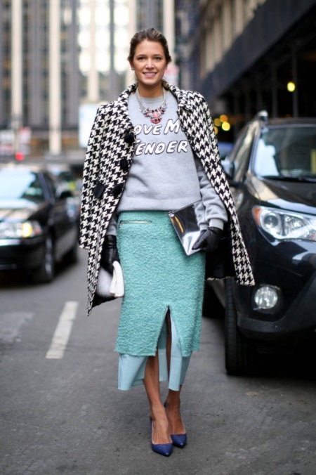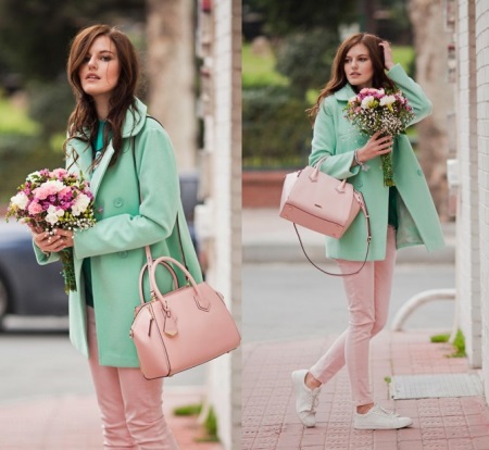 A mint coat is the best example of the relevance of this color not only in summer, but also in the cold season. This is not only a great way to stand out from the gray crowd, but also a wardrobe item that will lift your spirits even in the most dank weather. Pants and a bag of soft pink color complement the feminine and flirty solution, and the straight silhouette of the coat allows you to combine it with a bag of geometrically regular shape.