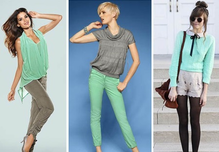 Combining mint with gray, it is better to complement the image with accessories of bright or dark colors: this will make the image contrast and help you to place accents correctly. Choosing jewelry to suit using mint color, it is better to rely on compatibility with additional colors.