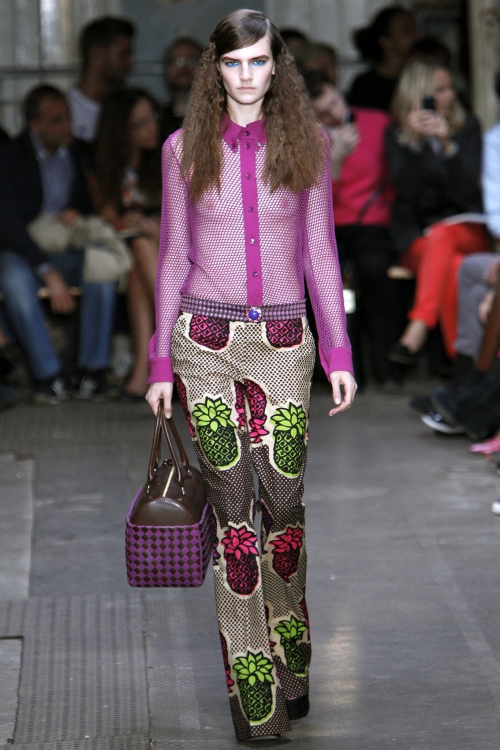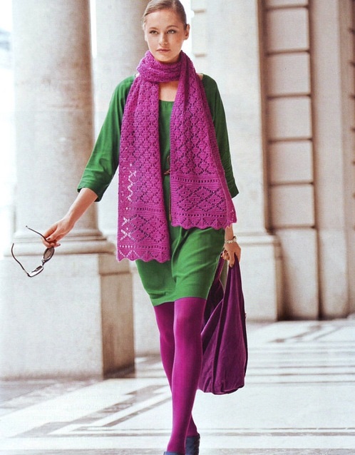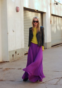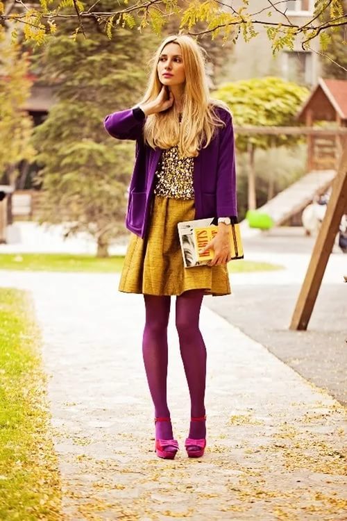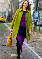 In one image, the related shades of purple are perfectly combined, diluted with a dress of juicy green shade. A great solution when you want to fill your everyday look with bright colors.