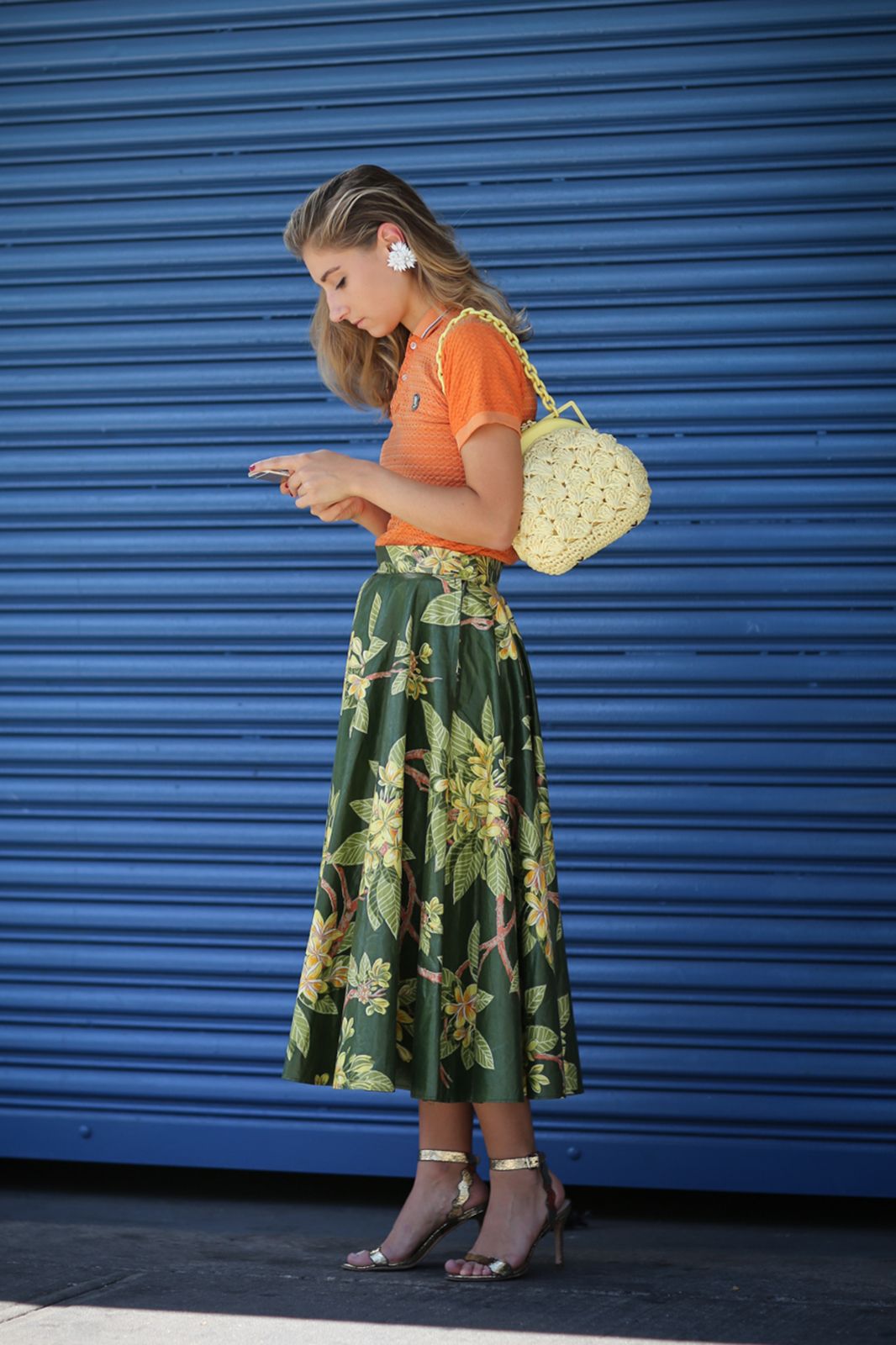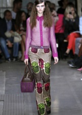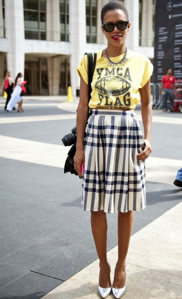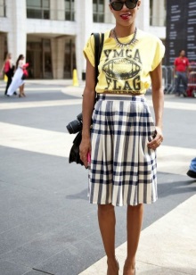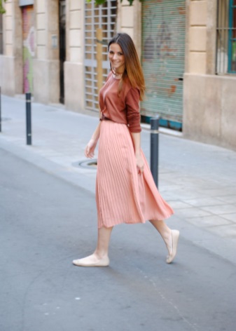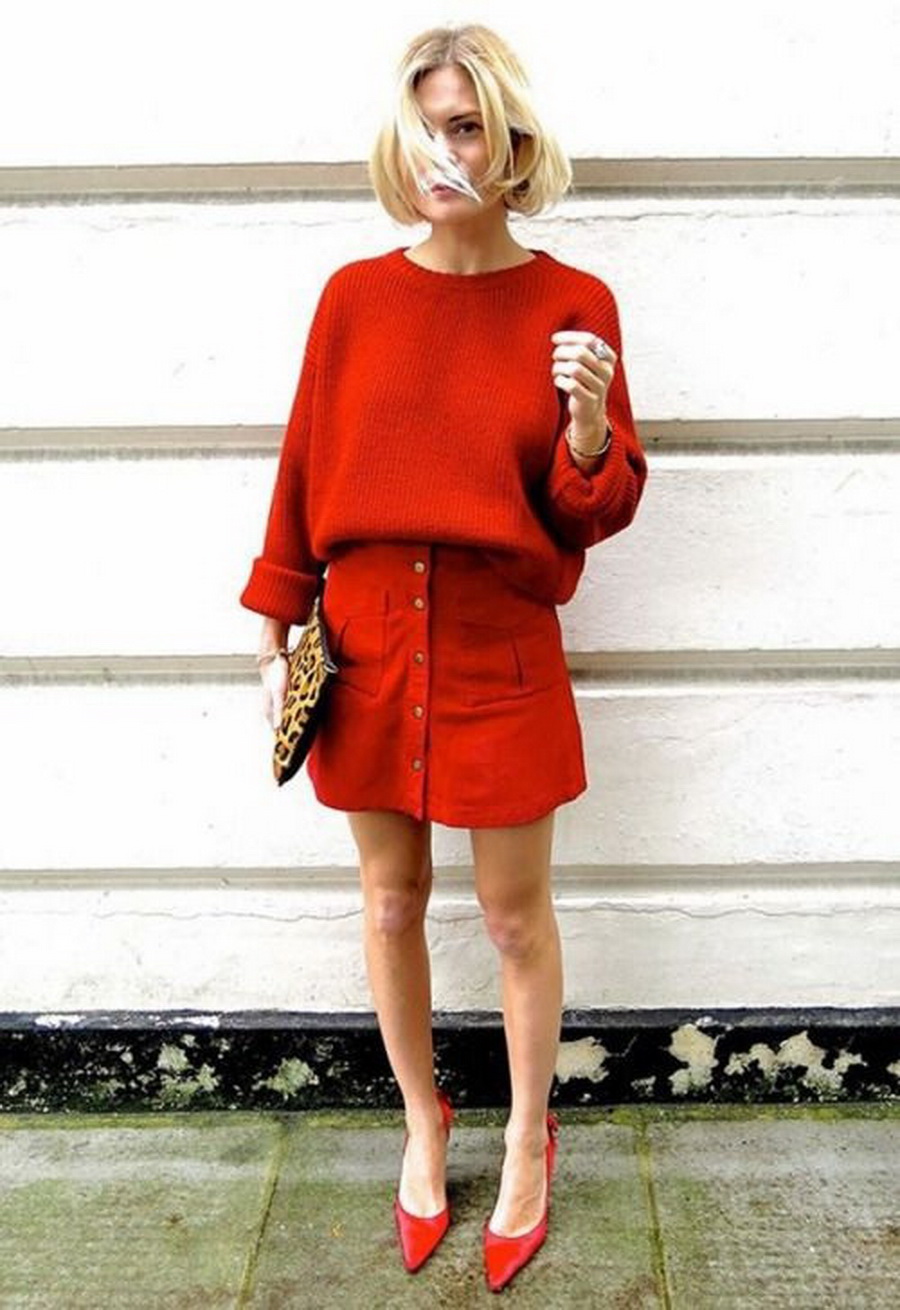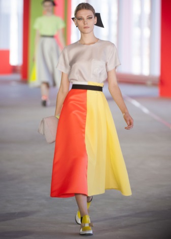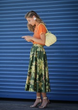 An unexpected combination that looks great in one image. Salmon-colored skirt and marsh shirt. The shoes and handbag are matched to the color of the shirt, so the skirt serves as a bright spot of the image, emphasizing attention. This technique is to adopt if you want to add the missing volume to the hips.