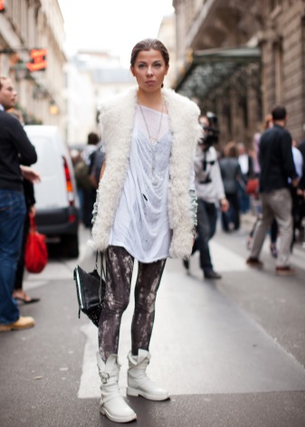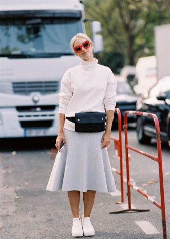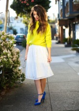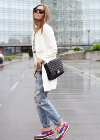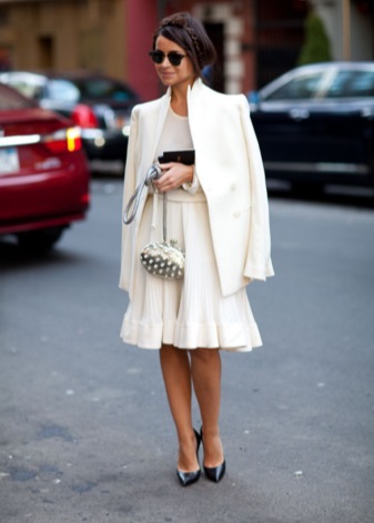The main taboo - do not wear white shoes with pants or jeans in black, and even more so, do not wear black tights. The bottom should be light and light, to match the shoes.