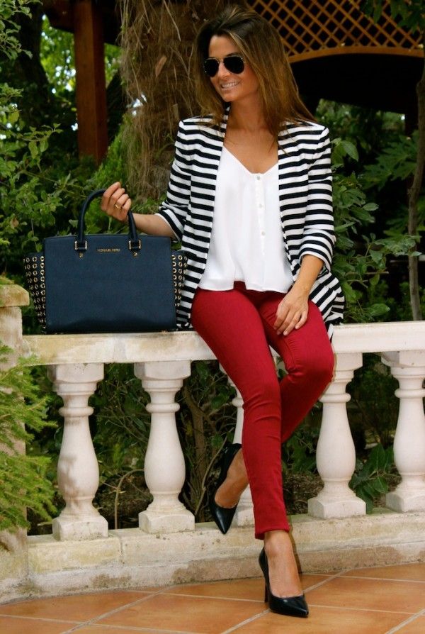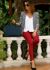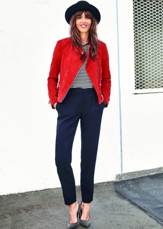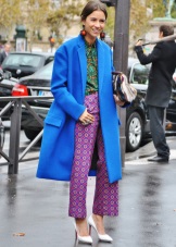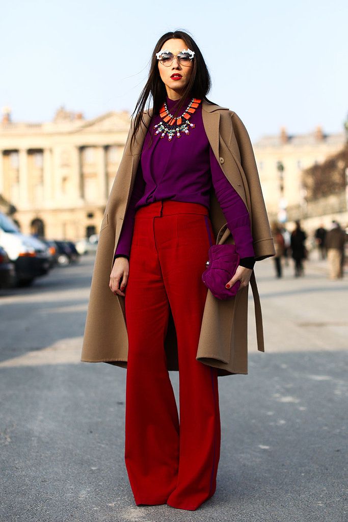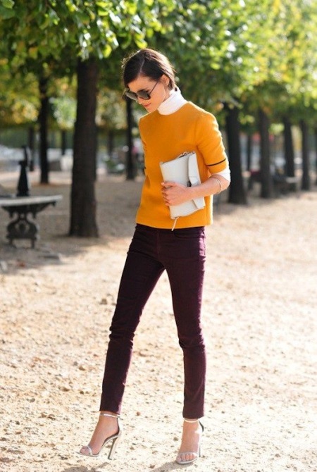 If you want to get a catchy and luxurious look, combine ripe berry pants with a blackberry shirt in one bow. So that this combination does not look too flashy, complement the image of a coat of coffee shade that will soften the look.