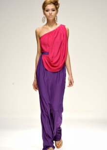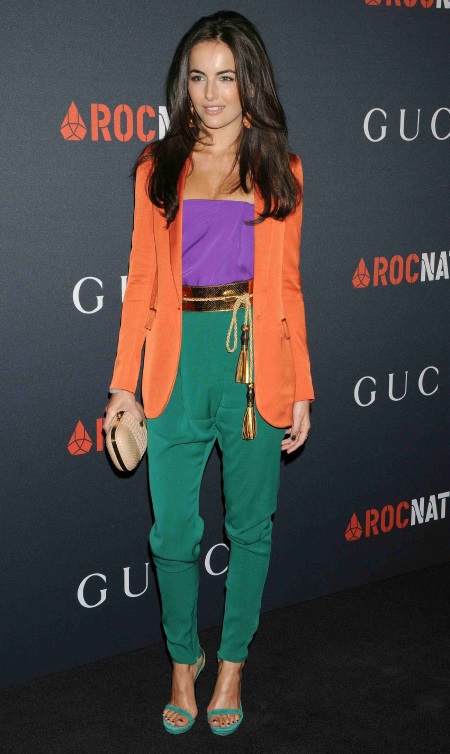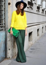 Trousers with a high waist malachite color, bright purple top, which can be replaced with a plum, and orange jacket. Great solution for a party and for the publication. The image is complemented by high-heeled sandals in tone with trousers, a golden belt, and a small golden clutch.