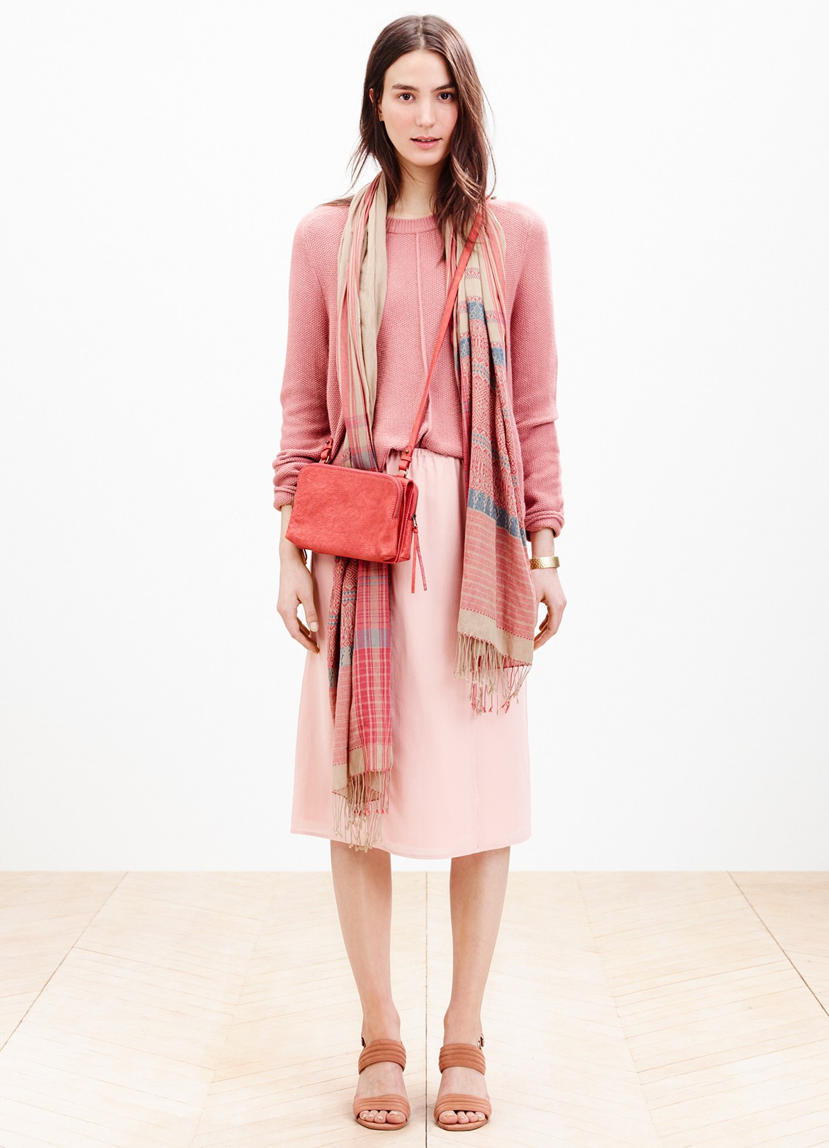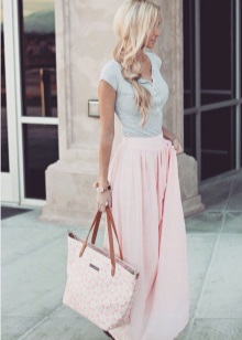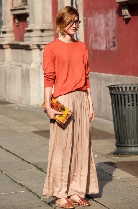 In a casual summer look, a sandy skirt to the floor is fine with a thin red jumper. Brown sandals and a floral print clutch complement this look. Soft relaxed look for every day.