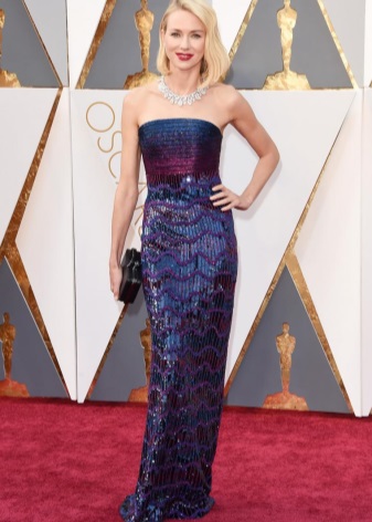 Today, shoes and accessories made of metallic leather are in fashion, so gold shoes will be the perfect complement to an evening dress, for example, eggplant tint. The image of the pendant on a long chain and clutch, decorated with sequins.