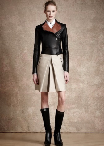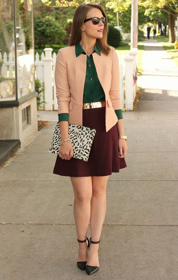 An interesting combination of a dark green shirt, cherry skirt and peach blazer. All shades are slightly muted, so they do not enter into a dispute with the appearance. The image is complemented by black pointed toe shoes and a black and white clutch.