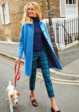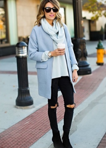 If you want a coat of this color, forget about the bright blue, only if you are not a young schoolgirl. Coats of sky-blue and cornflower-blue hues look attractive on girls and women. To pick up shoes and accessories for such outerwear is not difficult, it can be gray or beige-brown colors.