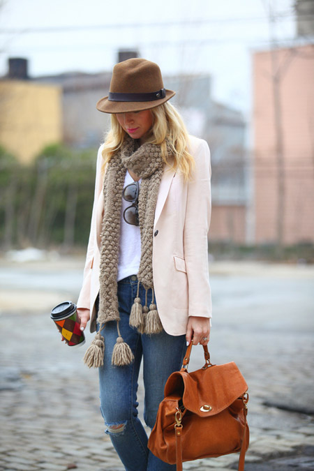 It is not necessary to wear bright clothes to get a harmonious look. Blue jeans, white t-shirt, jacket of milky color. Nothing remarkable, right? But the image is changing dramatically, thanks to accessories. A brown hat, a knitted cappuccino scarf and a brick bag. It turned out very stylish outfit!