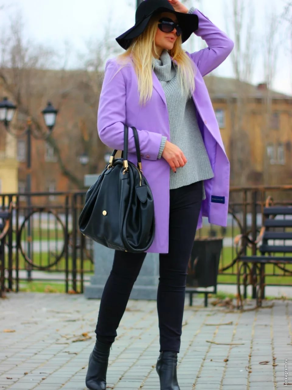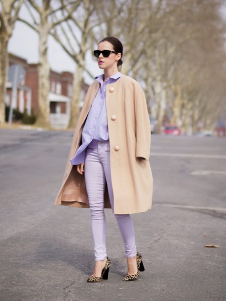 Very gentle spring look. Lilac skinny, a soft blue shirt, a coat of camel shade and leopard pumps, which in this look look completely vulgar, but very stylish.