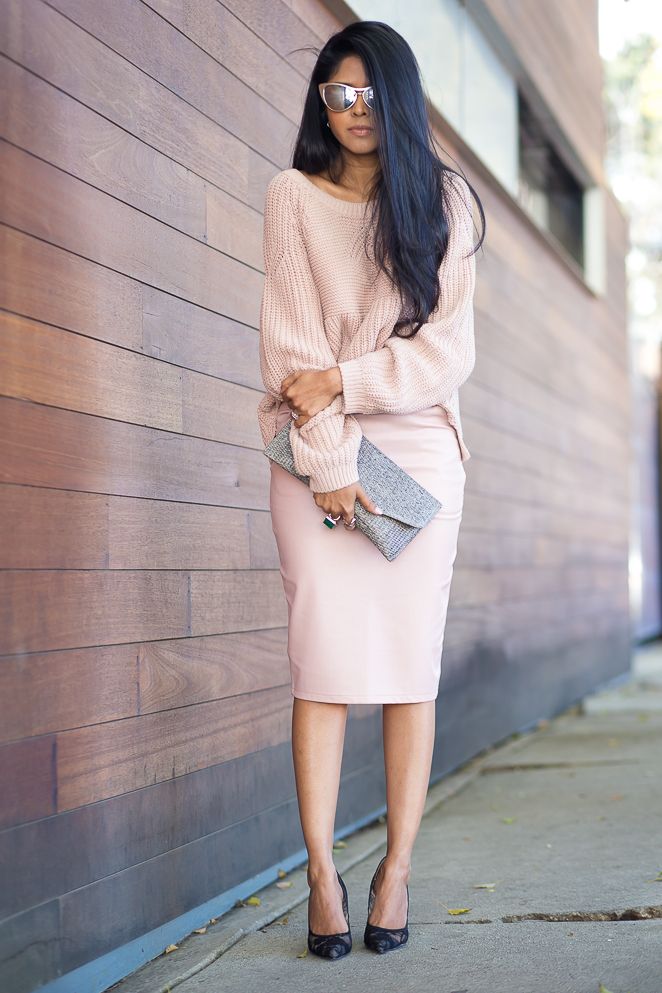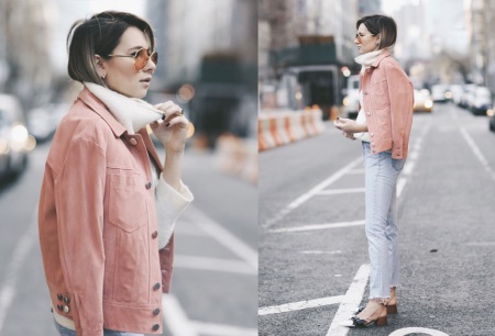 The beauty of this image is the use of clothing in the style of "unisex", made in soft pastel shades. Milky-colored sweater, dusty rose jacket, light blue jeans and low-heeled brandy-colored heels. It turns out an interesting game of contrasts, not colors, but shapes.