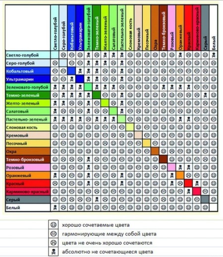 Today you can find a lot of tables that help you figure out whether the colors you chose fit together. It is also convenient to focus on the color wheel, which we have repeatedly mentioned, and which is shown below. You are also offered a table, focusing on which, it will be easier for you to make a choice and create harmonious images.