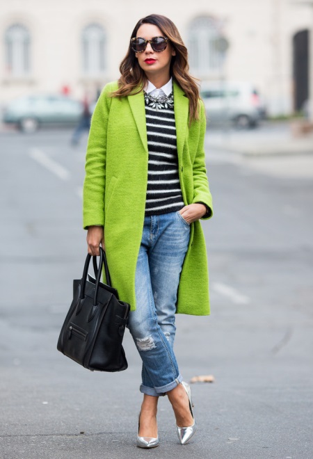 When you want bright colors, add to the calm image in the style of a casual coat of lime color. And to make the look even more spectacular, put on steel-colored metallic boats.