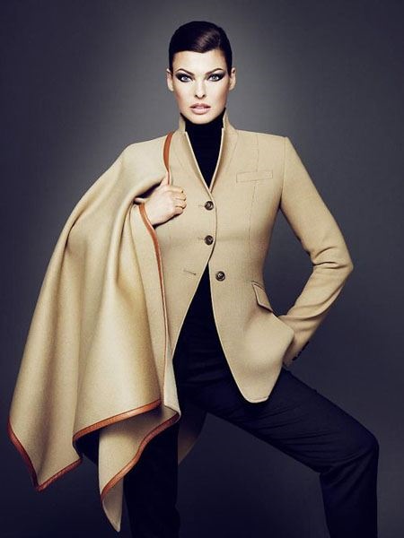 - In the second example, Linda Evangelista demonstrates things suitable for basic or office wardrobe. Since it represents a contrasting type, the presence of black in combination with a cool beige tint is justified in its image. For less casual types, it is enough to change black trousers and turtleneck to a cold shade of sepia. Elegant classic favorably emphasizes facial features.