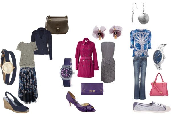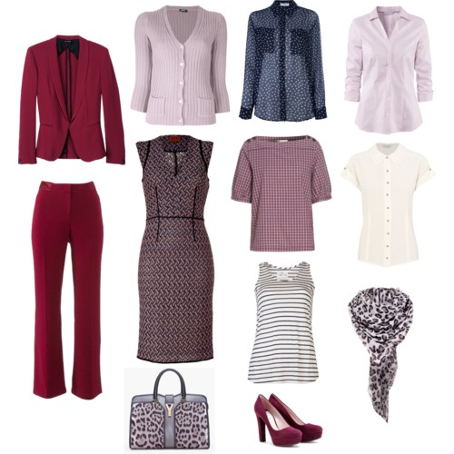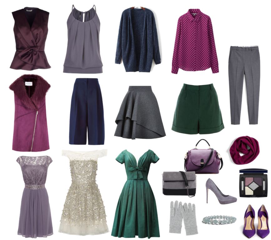 Basic wardrobe: outerwear + skirts, pants, blouses, dresses + shoes. Base colors range from light beige and gray to bright lingonberry, chocolate and purple.