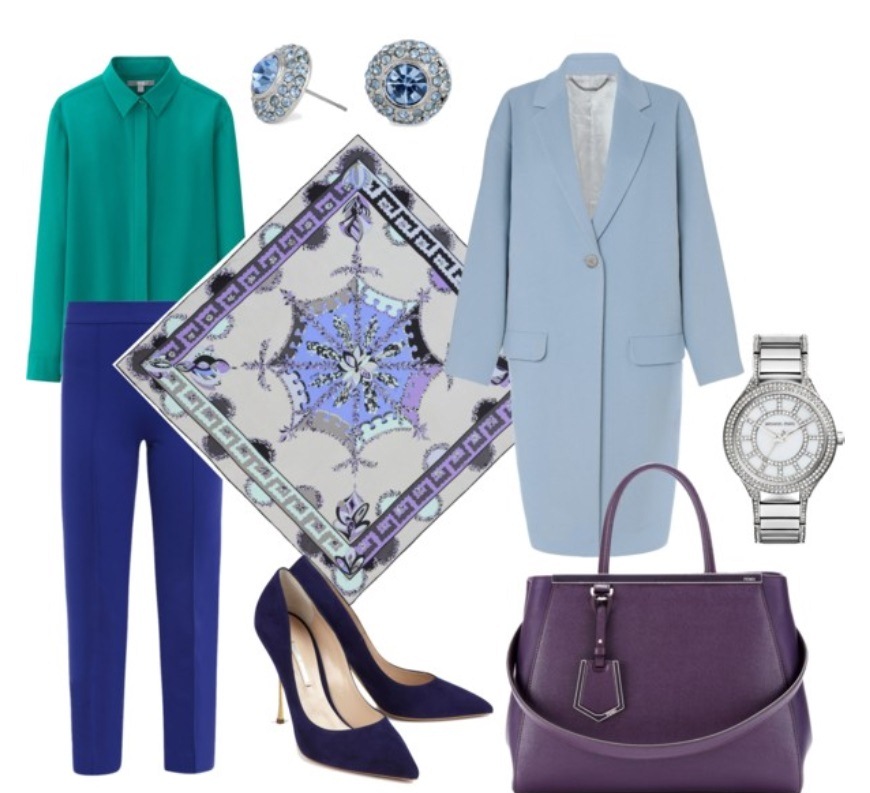 - Brightness. Violet dress and coat of emerald color are perfectly combined with each other and distinguish their owner. Accessories here should be modest colors, so as not to tire and overload. Makeup matte shades.
