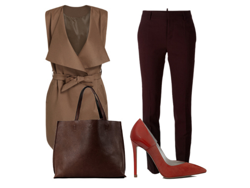 - Dark soft. Stylish and spectacular look for a city walk: red-brown trousers-pipes, a spacious bag to match them, and a beige top on the vest. The highlight of the image is dark red pumps.