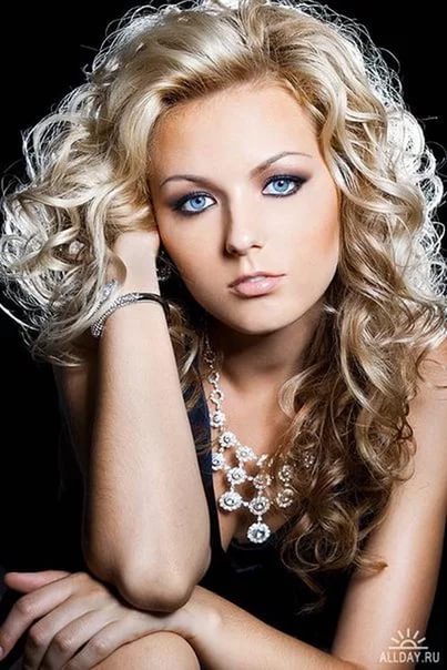 - Another example of the image of the girl-spring with light blond curls complemented by bright but unobtrusive makeup. Neat arrows and slightly darkened outer corners of the eyes emphasize their beauty and give the look more expressiveness, and pale pink lips look just great.