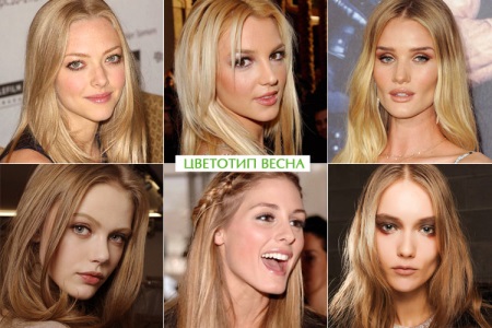 - The hair color of the girl - spring is never dark, so that burning brunettes and brown-haired women can immediately be safely attributed to another color type. The spring is distinguished from blonde summer women by the predominance of warm shades, such as golden blond, wheat-brown, and strawberry or peach blond.