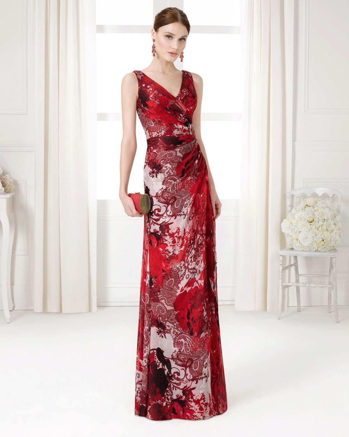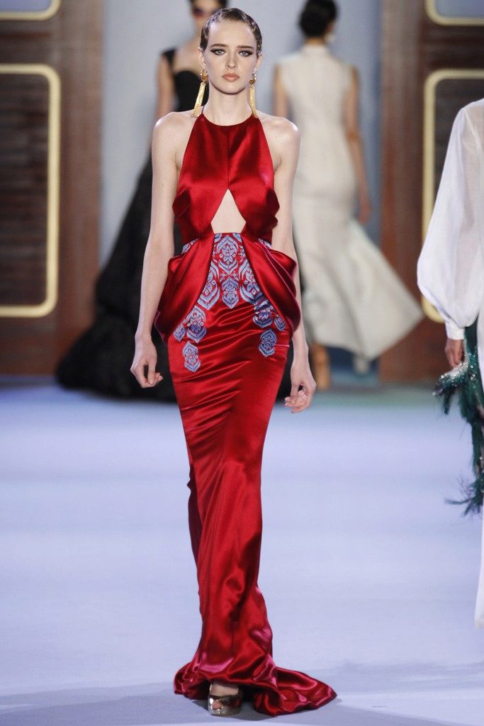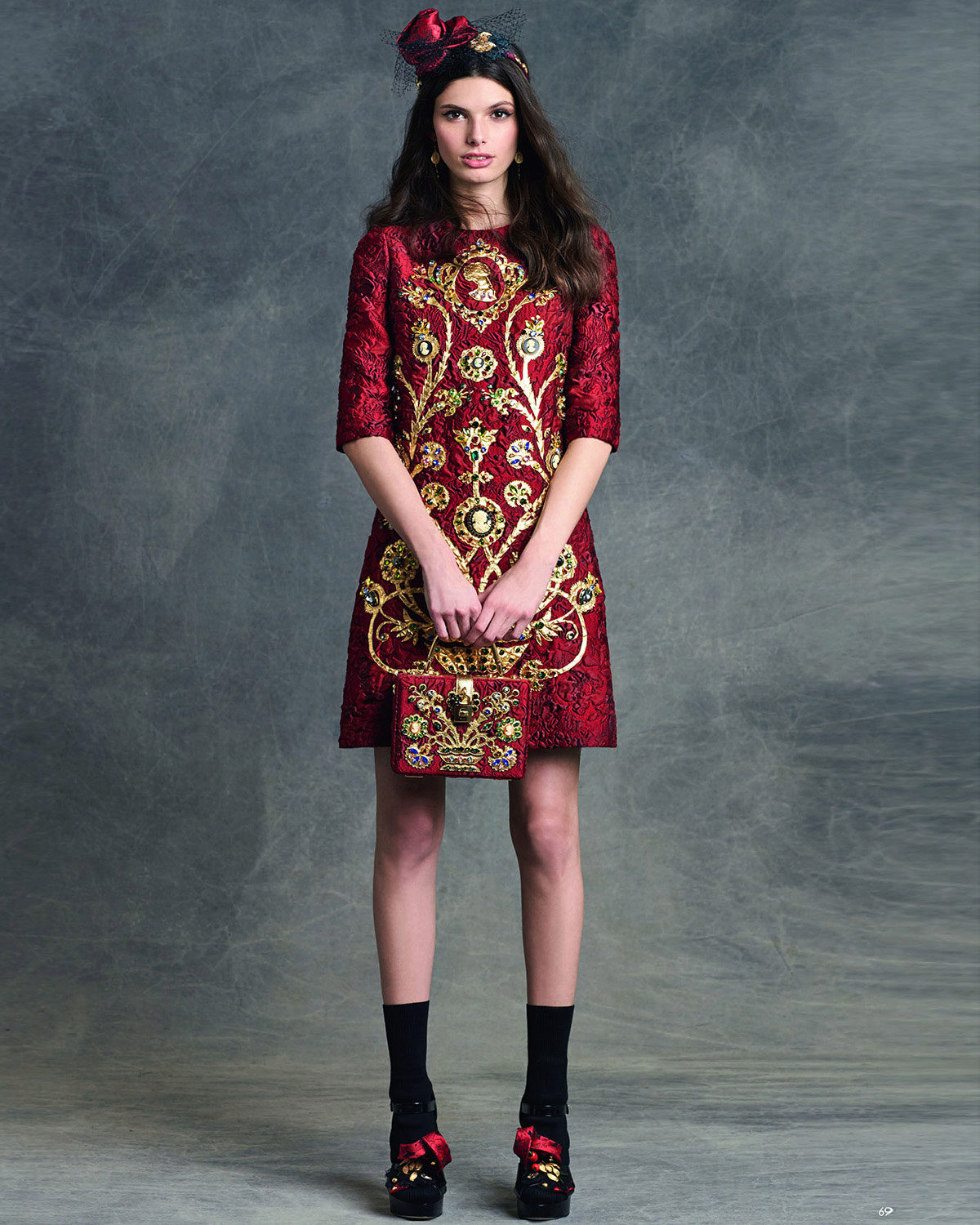Cherry-colored dresses are transformed when embroidered with gold and contrasting stones.