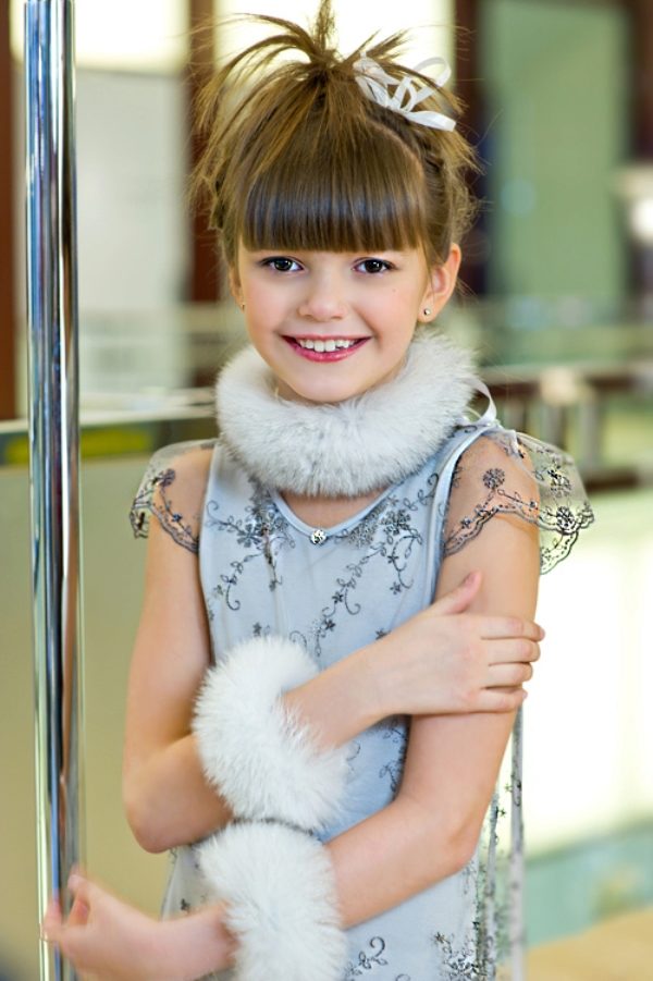Children's fashion copies the fashion of adults, so the first elegant dresses are very similar to real ballroom models. Long dresses are performed in a laconic cut, to which the closed shortened bodice and voluminous pastel-colored multi-layered skirt perfectly fit.