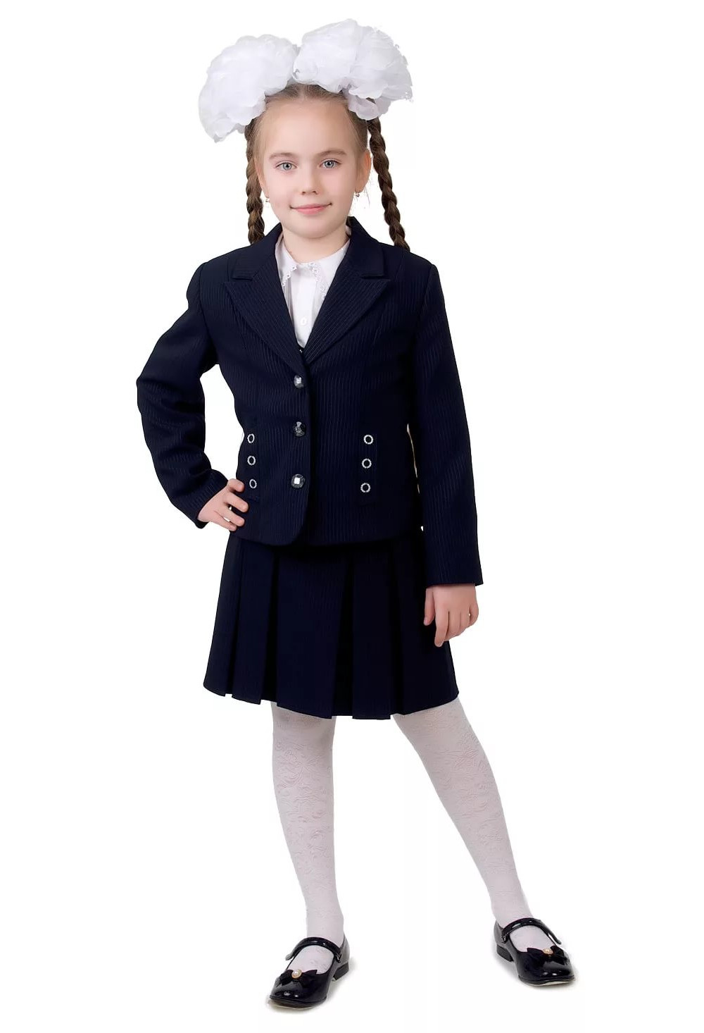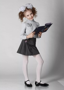 Classic shoes are always noticeable for moms for their daughters. The most successful will be a bow of a short skirt in the fold, blouse and a cropped jacket with a double-breasted button closure.