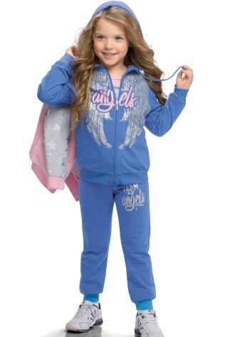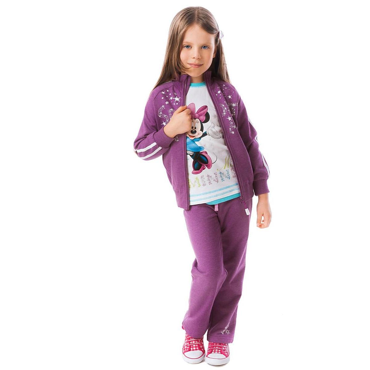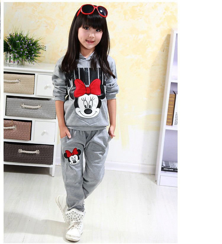 - Stylish tracksuit of gray dense fabric containing cotton fibers and knitwear, decorated with a nice print with a picture of baby Minnie Mouse. White leather sneakers with a long tongue embellished with silver large stones will be an excellent addition to the image.