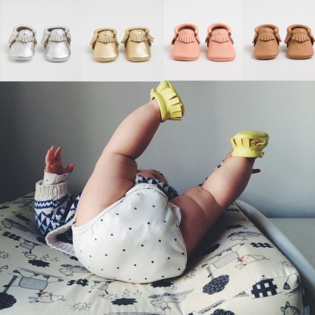 For the smallest you can buy an unusual model. Externally, it looks like moccasin socks, in fact, moccasins with a soft leather sole are sewn to a stretch sock made of cotton. Such shoes are ideal for children aged 5-10 months. It is pleasant to the touch, comfortable to wear and beautiful in appearance. For older kids fit moccasins, slippers.