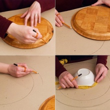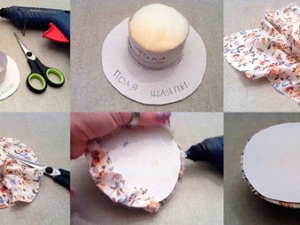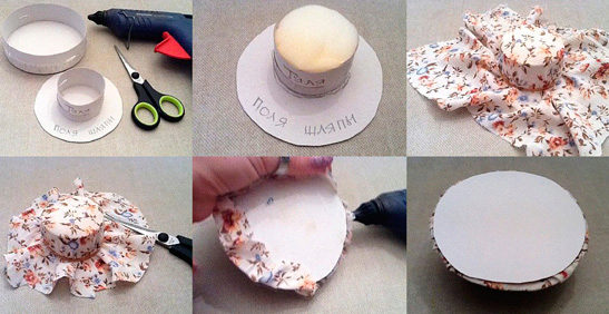- The next step: labeling the bottom on the cylinder base and cutting from the fabric of the circle. You need to cut with a margin so that you can turn a little on the cylinder. Glue the cut fabric to the bottom and tuck it.