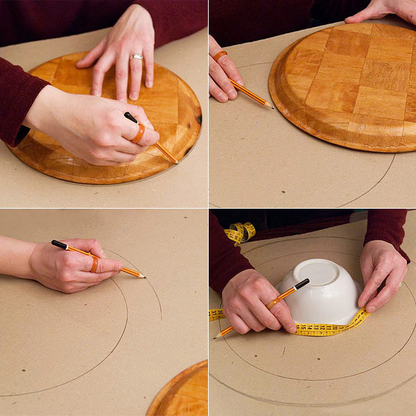 - First, cut out the cardboard circumference and the fabric base for the lining. Then you need to stick on the fabric base shabrak with iron. Using zigzag scissors it is necessary to cut the outer edges of the circle so that the fabric does not crumble.Using a pencil, make the markings on the back of where the bezel will be mounted.