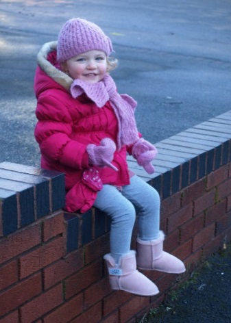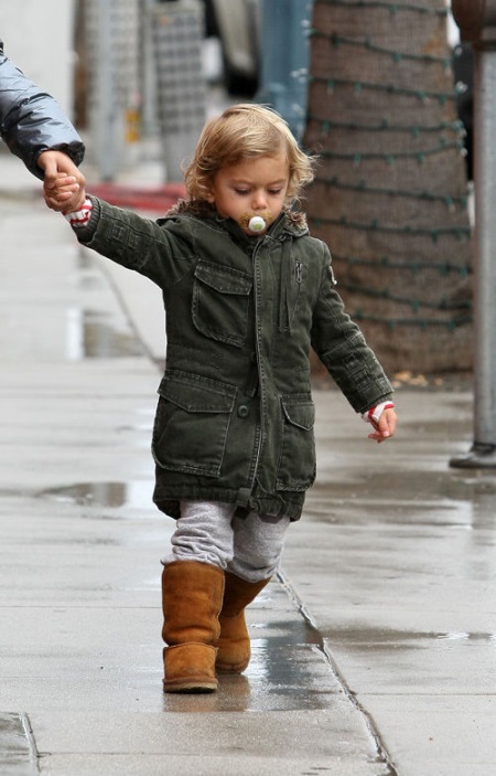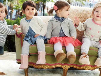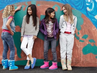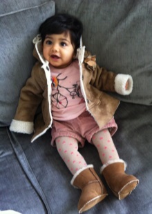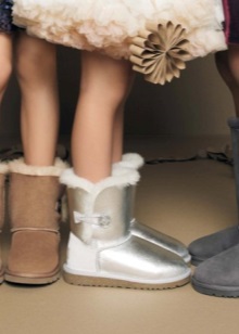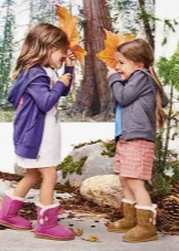 If you are going to buy these shoes to your child, you should understand that dressing with uggs and with what wardrobe they combine best. The most popular option is an ensemble with leggings or jeans. It is very important to pay attention to the length of the clothes. Pants should not be above the knees. Such a contrast - rude shoes and fragility of the legs - looks very good and is suitable for any event or rendezvous.