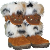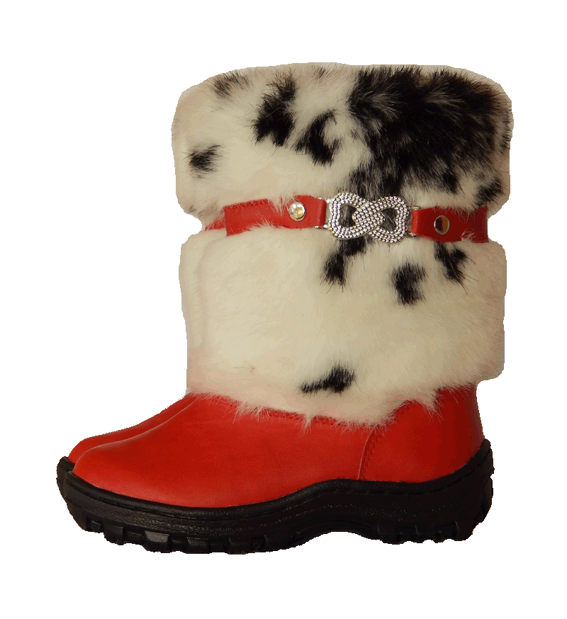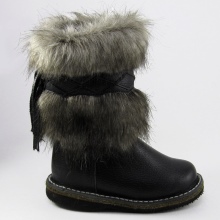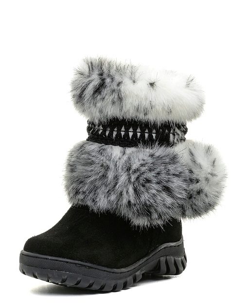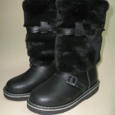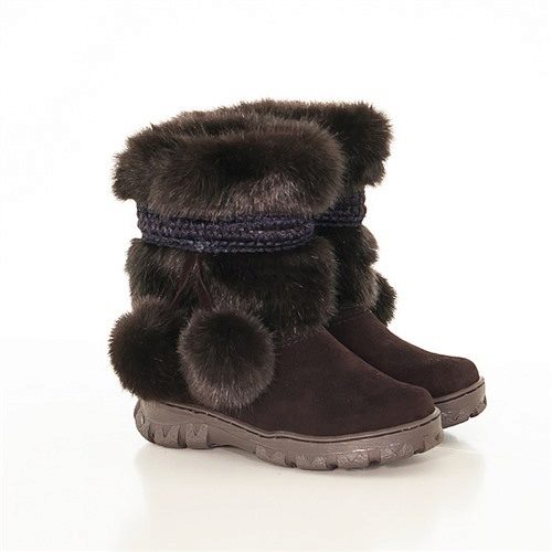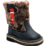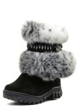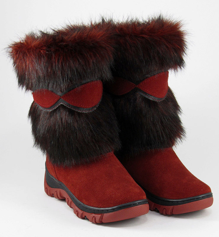 The classic model of high fur boots for girls 10-12 years old. The top of the shoes is trimmed with a combination fur: at the top is a fluffy fox, in the lower part the fur is shorter. The color scale of the boots is built on the contrast - red-brown fur and black leather bottom (decorative straps have the same color and texture). The thick felt sole is guaranteed not to let your feet freeze. It should be noted that girls wear such volumetric boots, as a rule with trousers, tucking them inside the shoes.