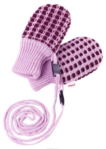 - But on walks over such mittens should be worn warm. For small users, they are also a bag. There are models with a small notch for a finger, but this is an option for older children for a couple of months. In order not to lose such small mittens, manufacturers make them with a lock, i.e. when they are not needed they can be attached to the jumpsuit and not worry that they will be gone.