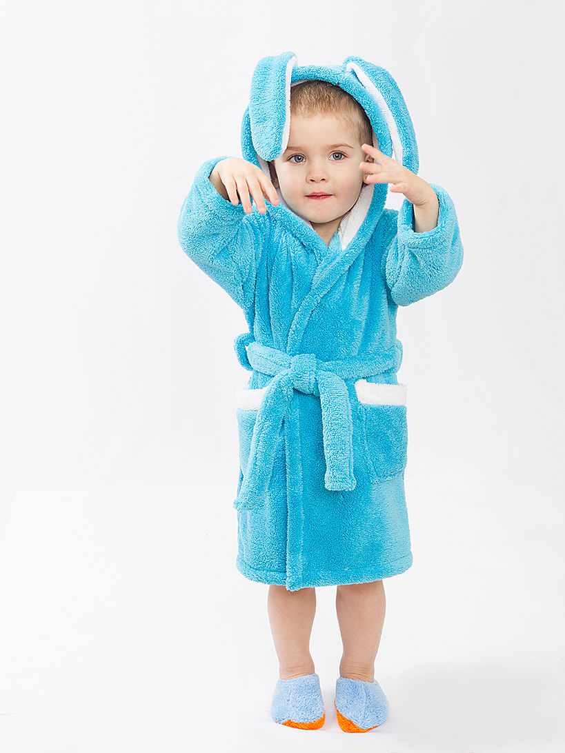 Double-breasted dressing gown with a belt. Children love him for the extra sensation of warmth and ease of putting on. Throwing it on the wet body, it remains only to tie a belt. Also, the smell is a good protection against blowing.