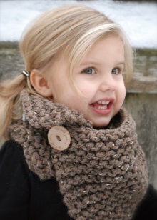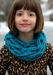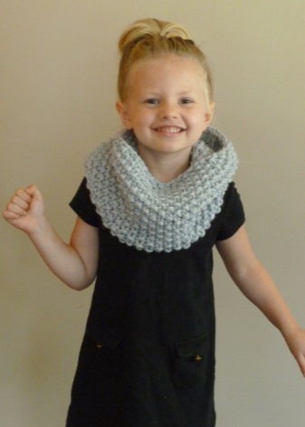 - A scarf collar is also called a penny. It is even easier to wear. Dickey is worn over the head, does not require fastenings. Knitted collar heats the neck, chest and back of the child. Products come in different colors, as well as they are decorated with decor and knitted elements.