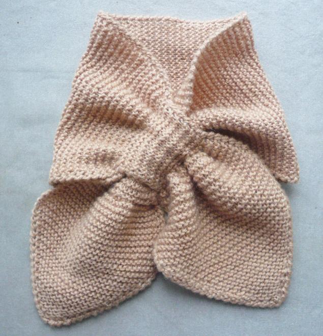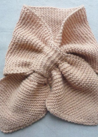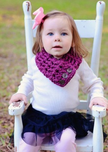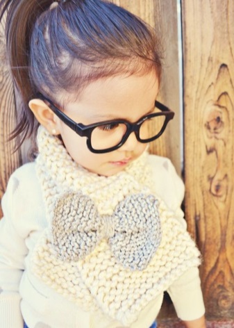 - Scarf-bows are the perfect option for a little princess. The style of the product is designed specifically for girls. These scarves look very original and attractive. The big advantage is that this model allows you to avoid the vagaries of the baby during dressing - as you know, children do not like the long process of tying laces and scarves before walking. You just need to thread one end of the scarf in the other - and so it turns out a bow. The chest is protected by a double layer.