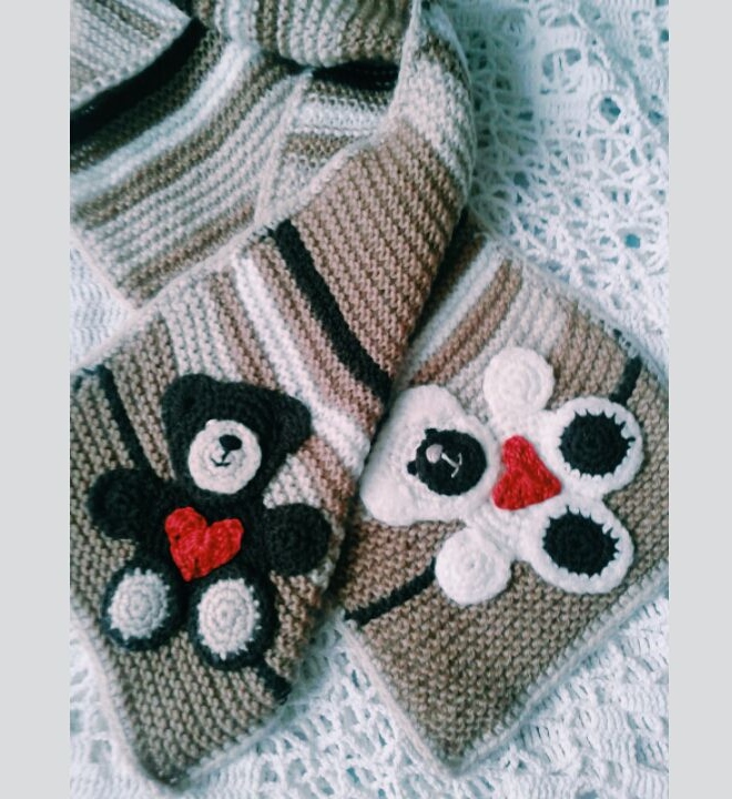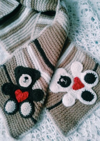 - There is an amazing variation for Harry Potter fans, of whom there are many among children. Scarves are decorated in the colors of the faculties of the Hogwarts magic school. Gray-green and red-yellow products with the image of animals (lion and snake) will undoubtedly capture the attention of children and their peers. In such children's knitted scarves, family photo shoots are often held.