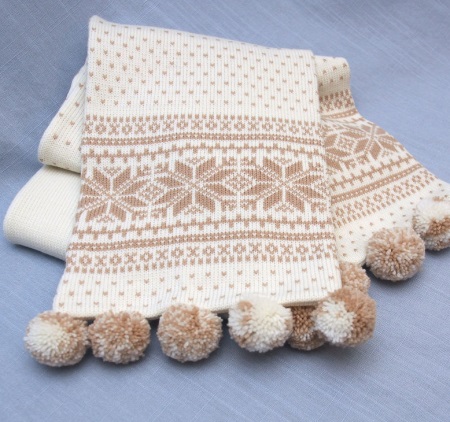 Also, designers love to decorate scarves with buttons, flowers and other knitted appliqués.